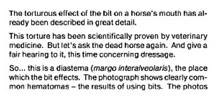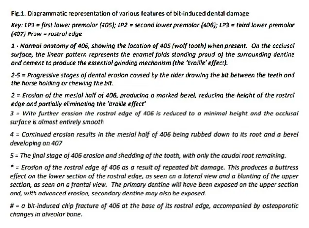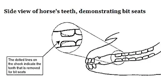Much of this evidence has been used to argue for the elimination of bits altogether. However, this is unrealistic. It is essential to focus on the avoidance of abuse. Some excessive interventions have included: tooth removal (see Grisone); the actual removal of parts of the tooth so artificially creating “bit seats”. An example is shown next.