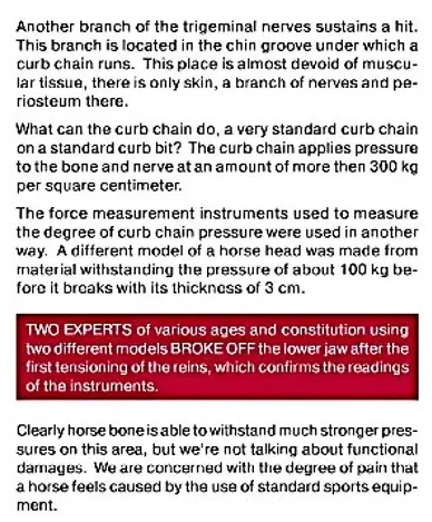 However, there are several items which have a particular relevance to rollkur. These are the sustained use of hard hands and short reins. Which force its head position backwards so that its jaw is virtually touching its chest. Consequently, the next quotes will look at research which has explored this matter further.