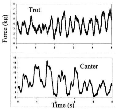 Comparing these two charts, show that in the case of the riding horse, the extremes are within a much narrower band (mostly in the 15-25 N range). The figures show only the left rein at the trot.